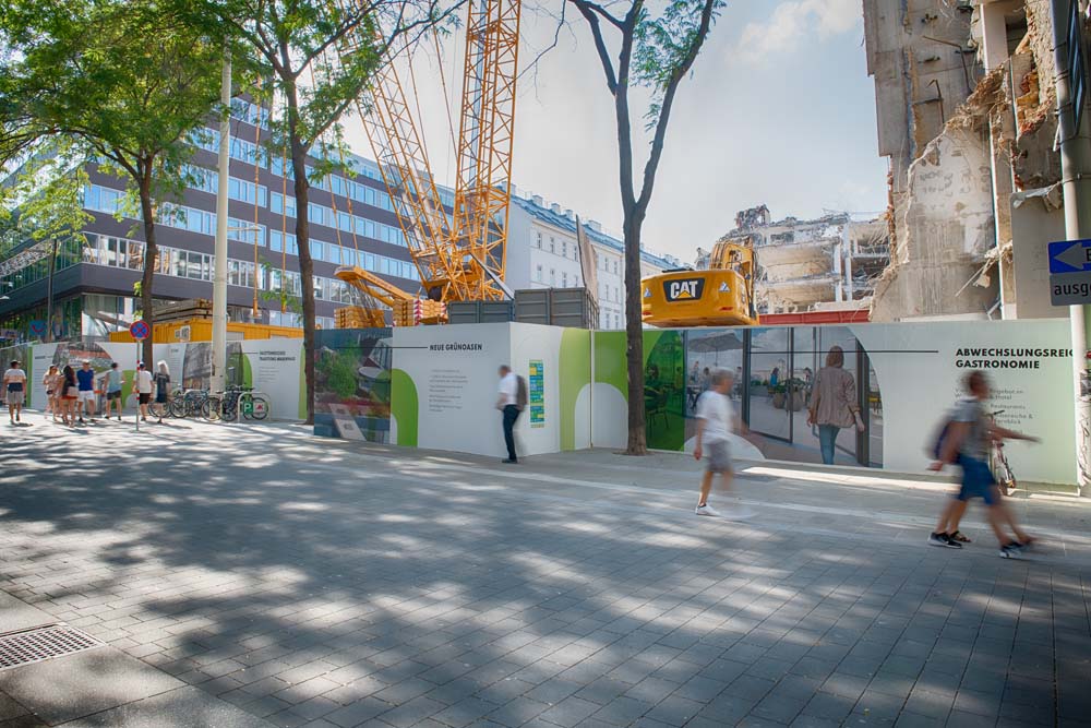 Da dieses Projekt noch in der Aufbauphase steckt kann man in der Mariahilferstraße derzeit nur erahnen was hier in Zukunft entstehen wird. Die Realität schaut anders aus – nämlich in Form einer Baustelle. Genau hier kommen wir ins Spiel: Ambient Art ist dafür zuständig diesen Anblick schöner und ansprechender zu gestalten. Wir haben dafür Bauwände aufgestellt und diese auch gebranded und mit Informationen über das Projekt versorgt. Um den Passanten eine Vorstellung zu liefern, wie diese Immobilie nach ihrer Fertigstellung ausschauen kann und um diese auch erleben zu können, wurde weiters ein Container zu eine Art Showroom umgebaut und auffallend platziert.