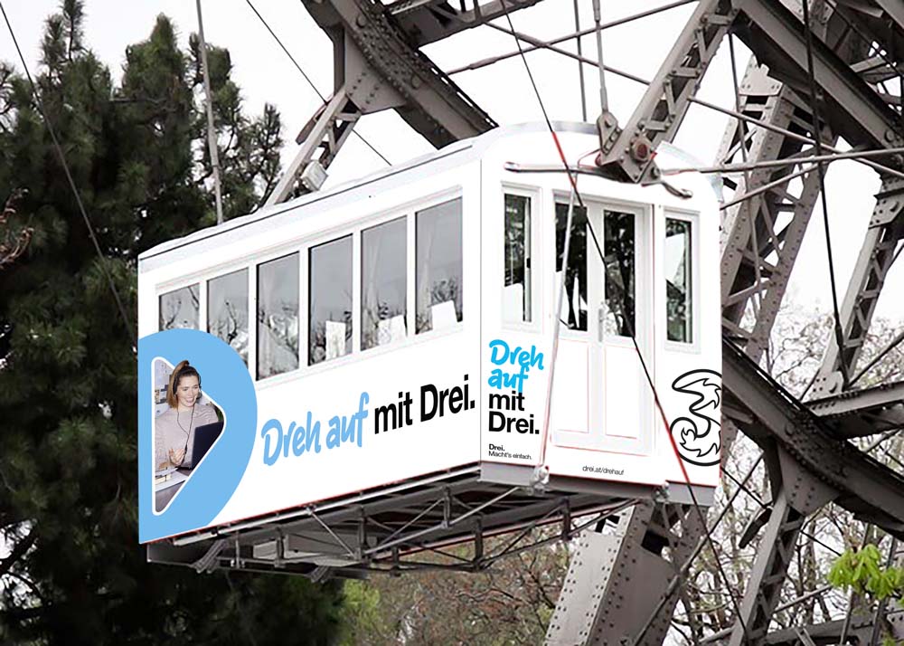 Woran denkst du, wenn du Wien hörst? Vermutlich an das Riesenrad, und genau das ist der Schauplatz einer Zusammenarbeit mit dem Unternehmen Drei. Das Projekt war Teil der „Dreh auf mit Drei“ Kampagne die den Startschuss für Drei als Komplettanbieter symbolisieren sollte. Neben TV-Spots, Social Media Werbung und diversen Online-Formaten sollte ebenso das Riesenrad als Werbefläche verwendet werden.
