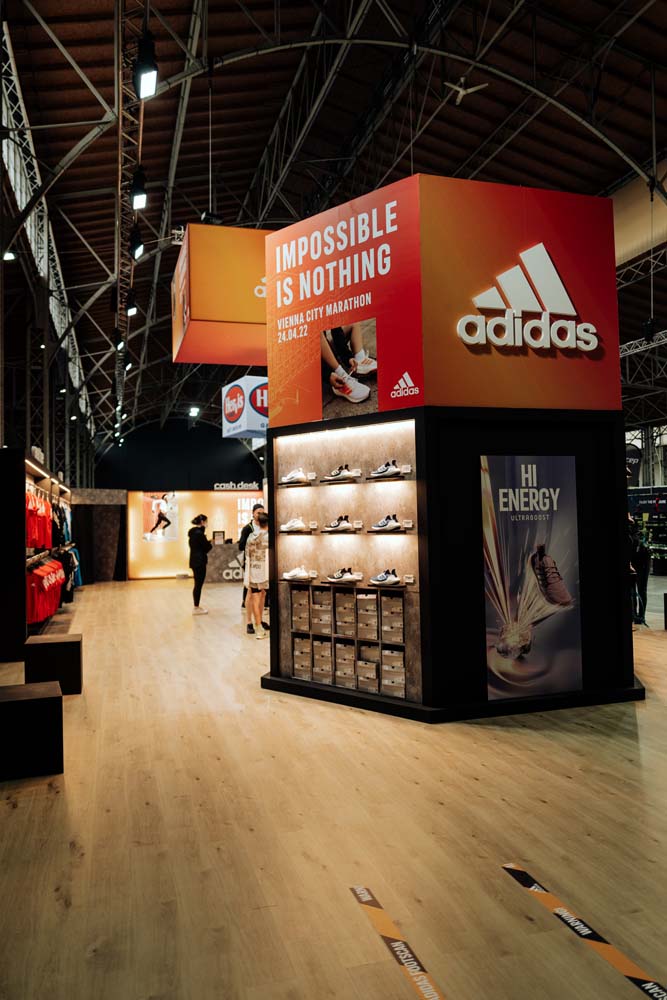 Der Vienna City Marathon ist mit rund 30.000 Läufern das spektakulärste Frühjahrsereignis in Wien – bevor es aber ans Laufen und Schwitzen geht muss sich jeder Teilnehmer erst eine Startnummer holen. Dafür pilgern Menschenmengen, Tage vor dem Lauf in Richtung Marx-Halle und genau hier kommen wir ins Spiel. Adidas ist bereits zum dritten Mal auf uns zu gekommen mit dem Auftrag einen Messestand zu planen. Von der Konzeption, dem Design und dem Aufbau kann alles aus unserer Hand.