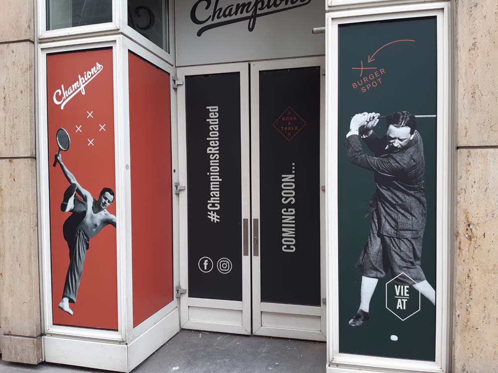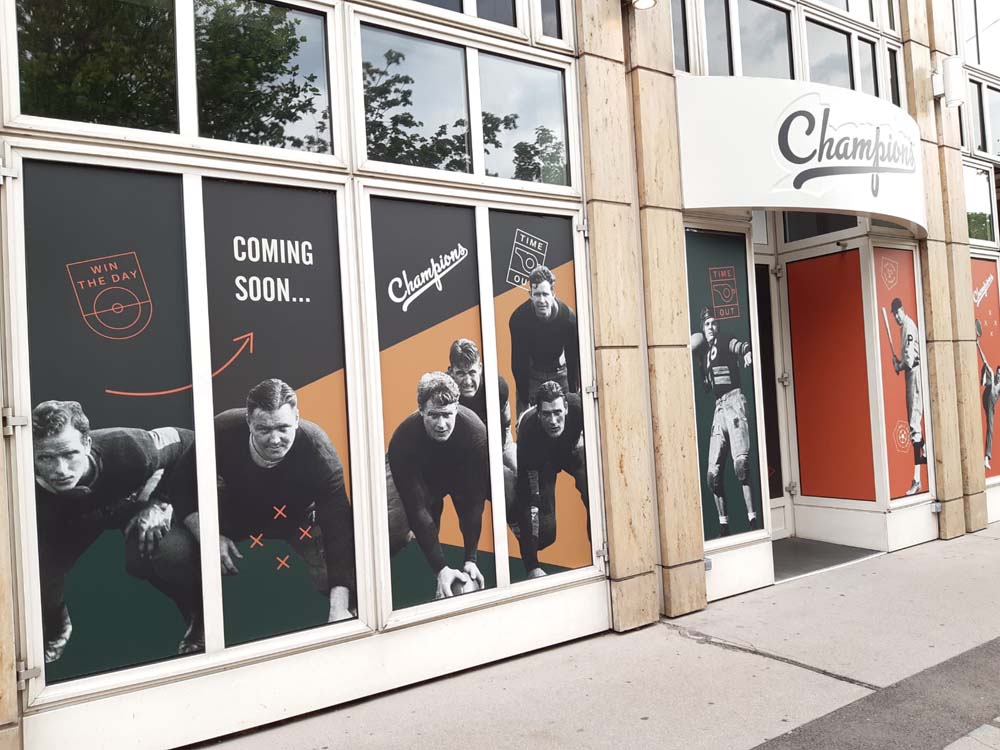 Baustellengestaltung der Außenfassade im Retro-Stil der Champions Sportsbar, Branding Outdoor + Indoor, Konzept, Idee